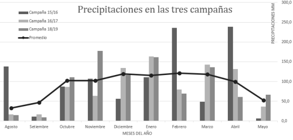 Para evaluar las condiciones climáticas durante la ontogenia del cultivo se utilizaron los datos obtenidos de la Estación Meteorológica de la Facultad de Cs. Agrarias de la UNR, distante a 100 m del ensayo. En la Figura 1 y Figura 2 se muestran la distribución de las lluvias y las temperaturas medias del aire durante todo el ciclo del cultivo, en las tres campañas, como también los valores medios históricos de las precipitaciones (1973 – 2017) (Material suplementario).