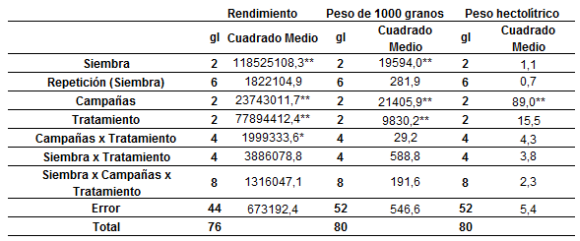 Las variables fueron analizadas mediante ANOVA y las medias de los tratamientos de REND se compararon a través del test de comparaciones Tukey-Kramer, mientras que para el P1000 y PH se utilizó el test de Duncan (p≤ 0,05) (Box et al., 2011).