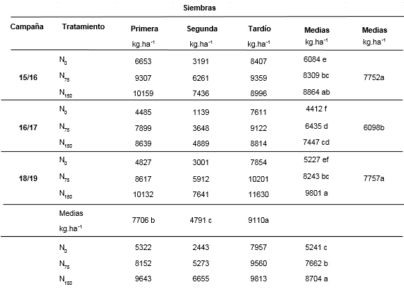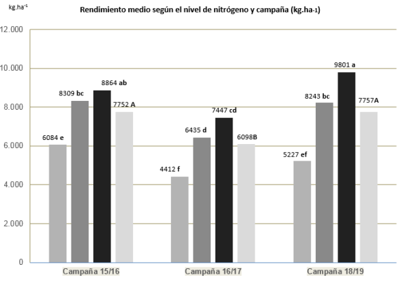 Los REND medios, según nivel de nitrógeno y campaña, no mostraron diferencias significativas en las campañas 2015/16 y 2018/19, mientras que en la campaña 2016/17 (asociado a la menor disponibilidad hídrica durante dicha campaña) fue un 21% menor que la campaña 2018/19 (Figura 4 y Tabla 2).