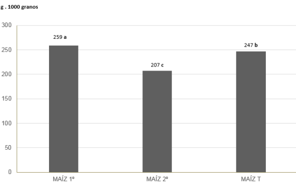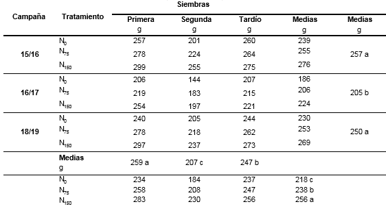 El P1000 varió desde 144 g (tratamiento testigo del MAIZ 2º, en la campaña 16/17) a 297 g (tratamiento de 150 kg N. ha-1 del MAIZ 1º, en la campaña 18/19).