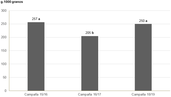El P1000 no mostró diferencias significativas en las campañas 2015/16 y 2018/19, siendo la campaña 2016/17 la que presentó el menor P1000 (asociado a la menor disponibilidad hídrica durante dicha campaña), y difirió significativamente (p<0,05) de las campañas antes mencionadas (Figura 6 y Tabla 3).
