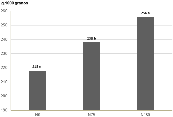 En lo referido a las dosis de nitrógeno, el P1000 se incrementó significativamente (p<0,05) a medida que se aumentó la dosis de nitrógeno. La magnitud del incremento fue del 9% con las dosis de 75 kg N. ha-1 y del 17% con las dosis de 150 kg N. ha-1 (Figura 7). Esta correlación positiva fue confirmada por Papucci (2008, 2016).