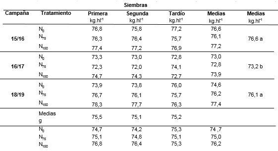 El PH fue una variable muy estable, solo se observaron diferencias entre las campañas (Tabla 4). La campaña 2016/17 fue la que mostró un PH significativamente menor que en las otras dos campañas analizadas (p<0,05). Este menor peso fue un 5% menor que en la campaña 2015/16 (campaña 2015/16:76,6 vs campaña 2016/17: 73,2). La campaña 2016/17 fue la que contó con la menor disponibilidad hídrica, lo que explicaría el menor PH obtenido en la misma, en coincidencia con lo observado por Papucci et al., (2008).